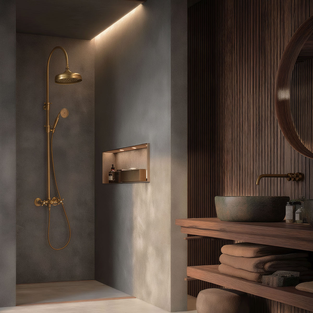 Interiéry v zimě mají svůj vlastní rytmus. Domy začínají ze svého nitra zářit, jak světlo zjemňuje a vzduch zpomaluje. Během sváteční sezóny se luxus nalézá spíše v teple, introspekci a důrazu na detaily než v hojnosti.Koupelna, která je často přehlížena při svátečním stylizování, je jedním z nejexkluzivnějších způsobů, jak do vašeho domova vtělit jemný luxus. Celkovou atmosféru lze změnit vhodnými armaturami, zejména těmi s dozlatova a bronzovými povrchovými úpravami. Proměňují utilitární prostor na klidné útočiště, které je zároveň sváteční a klasické.Tyto kovy nevyžadují pozornost. I minimalistické koupelny získávají pocit poklidné velkoleposti díky jejich záři, která zachycuje jemné zimní světlo a vyvažuje chladné tóny kamene a dlaždice.